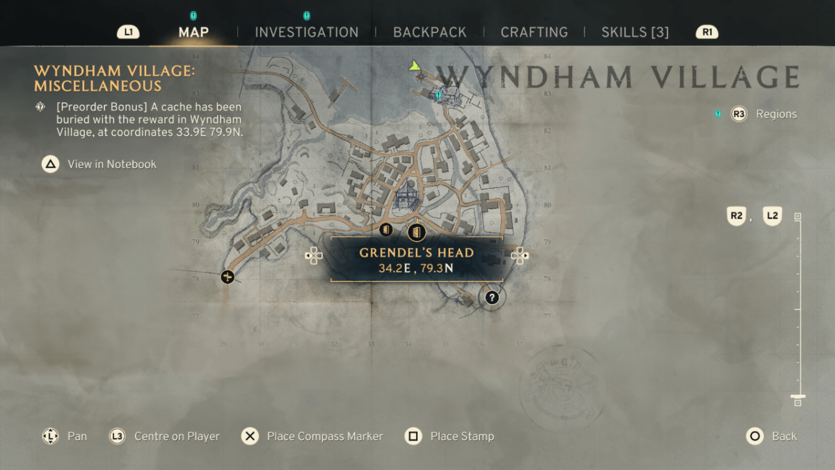To complete the first Buried Treasure Lead and get the “Enhanced Supply Bundle” Pack, head to the Village Green just northwest of Grendel’s Head. Be sure to track the Lead and open the map to mark the location on your compass as we’ve done above to make finding it even easier.