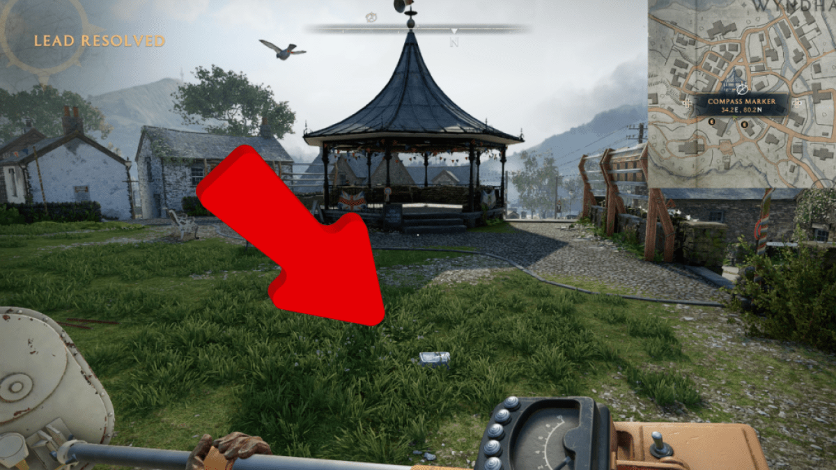 Open up your investigation menu and track the other Lead called “Buried Treasure” within the notebook. This one will unlock the “Basic Supply Bundle” and is also located in Wyndham Village, with the coordinates 34.2E, 80.2N. Again, mark this location on the compass.